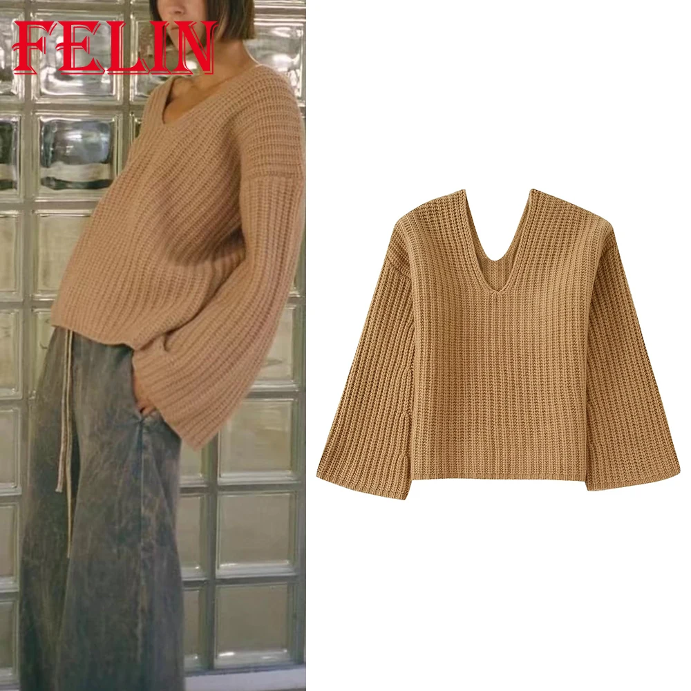 TRAF 2022 Autumn Woman Fashion V-Neck Casual Solid Sweater Flare Elegance Sleeve Knit Pullovers Female Loose Comfort Women Tops