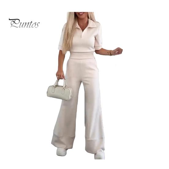 2 шт./компл. Женская повседневная рубашка и брюки, однотонный весенне-летний отложной воротник, короткий рукав, высокая талия, широкие брюки, длинные брюки M бежевый