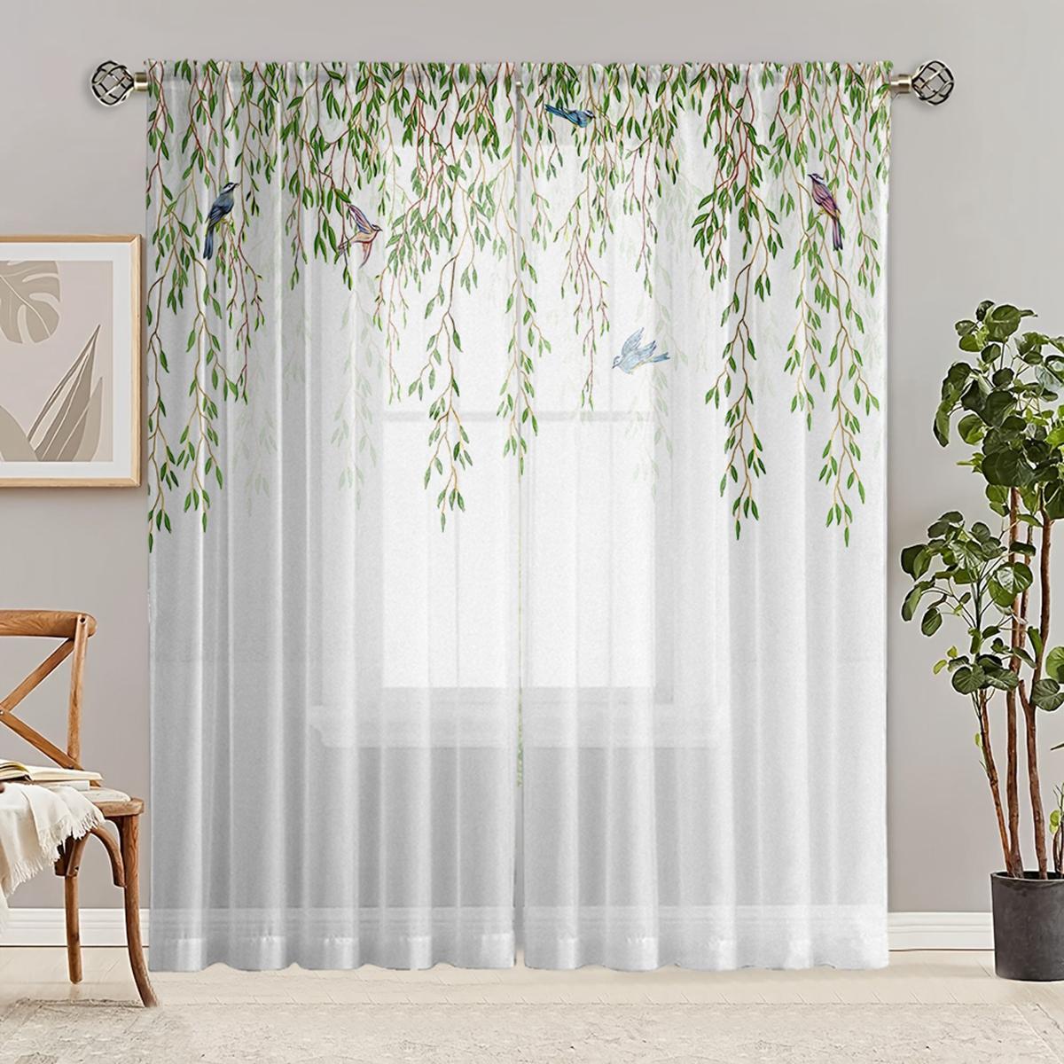 2 шт. HD цифровые маленькие свежие зеленые шторы с принтом плакучей ивы для украшения дома, стиль украшения гостиной, спальни, стержни W52H63inchW132H160cm белый