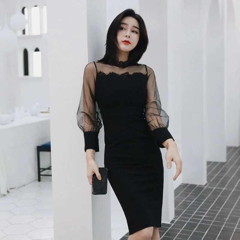 Women Lace Patchwork Basic Wear Bodycon Midi Dress Women Black Autumn Winter Dress 2019 Ropa Mujer Lace Patc Sexy Wrap Dress