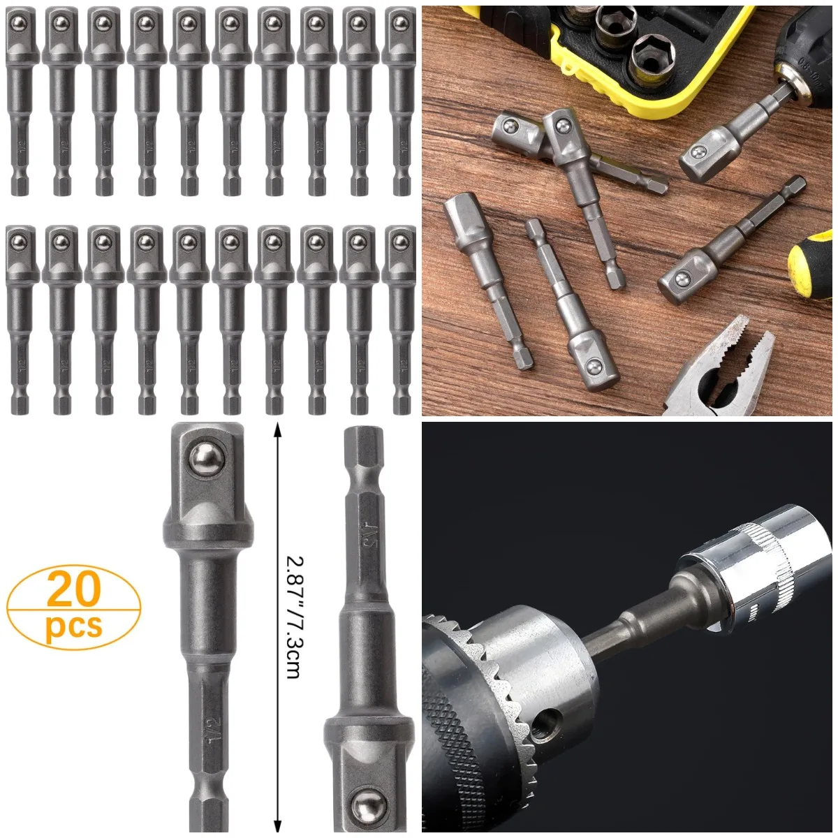 20-Pack 1/2' Square Socket Adapter Bit Set, Hex Impact Driver Bits for Automotive DIY