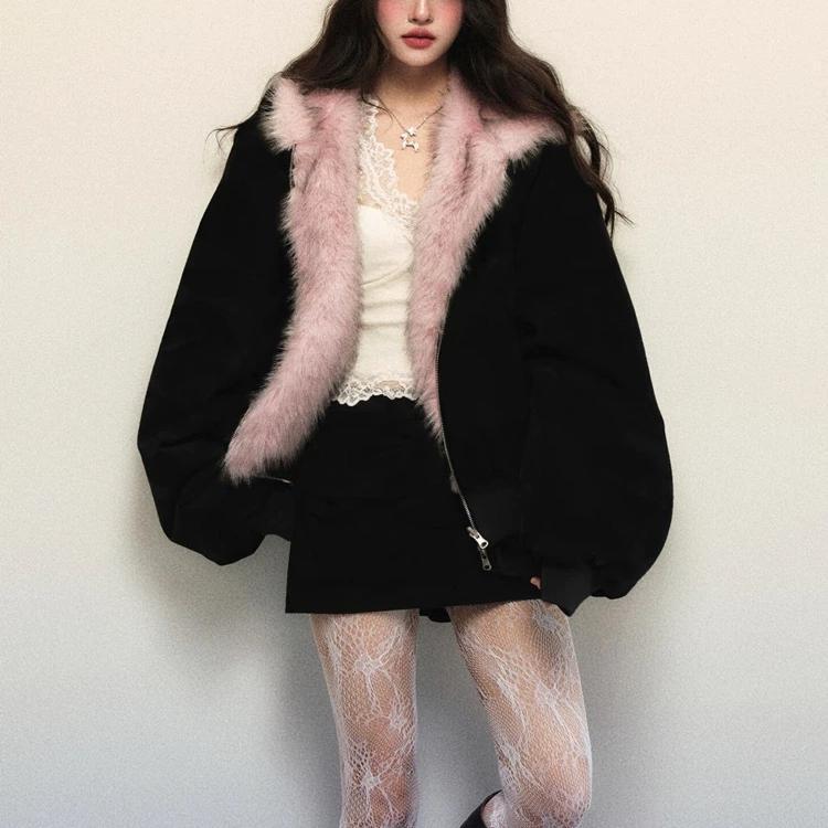 Спереду та ззаду двоє одягнених у рожеву пухнасту куртку з капюшоном, жіночу зимову американську ретро-ліниву вітерну вільну хутряну куртку S чорний