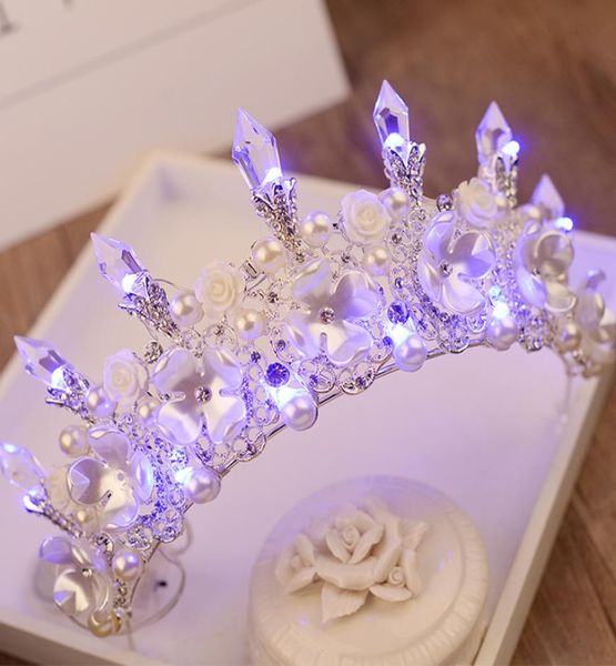 2017 new baroque handmade led tiara women crystal floral headdress pearls rhinestone light crowns wedding hair accessories hg126 s4573002, Slivery;golden