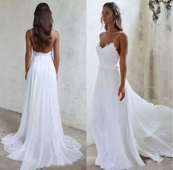 2019 Спагетти Ремни Шифон Линии Летние Пляжные Свадебные Платья Кружева Топ Спинки
