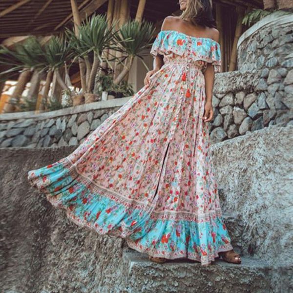 2019 богемное платье женщины летом с плеча boho длинные платья рюшами винтаж висообразные привязанные к высокой талии летнее цветочное плать, Black;gray