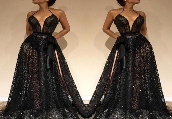 2019 black formal evening dresses halter deep v neck lace sequins side split prom gowns long sweep train red carpet fashion w6381307, Black;red