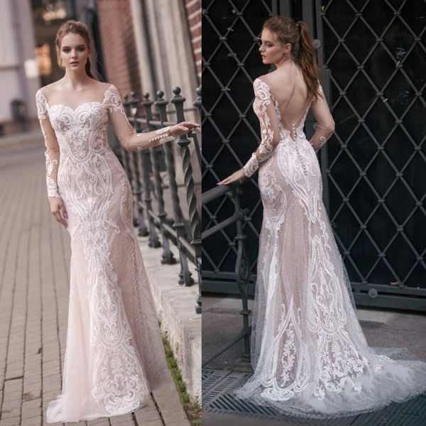 2019 long sleeve wedding dresses sweep train lace mermaid bridal gowns backless vestido de novia plus size boho wedding dress, White