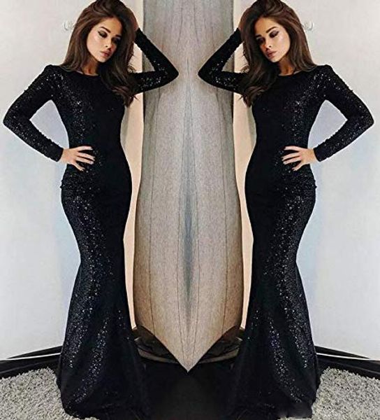 2019 long sleeves sequins mermaid prom dresses crew neck sweep train formal party evening gowns, Black