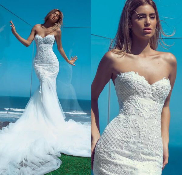 2019 nektaria mermaid wedding dresses sweetheart lace appliqued abiti da sposa beach wedding dress court train custom made bridal gowns, White