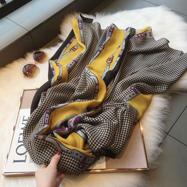 2020 зима темперамент соответствие цвета цепь, тысячи птицы проверка платок, шелковый шарф, весна осень хлопок и конопля, Blue;gray