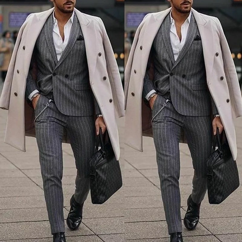 2020 серые полосатые повседневные мужские костюмы, двойной Brested деловая офисная одежда, смокинг, костюмы жениха для мужчин, свадебные приталенные блейзеры, костюмы