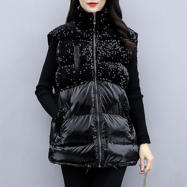 2020 fashion sequins patchwork womens sleeveless cotton parkas korean autumn winter loose fit zip lapel female warm waistcoats 1023, Black;white