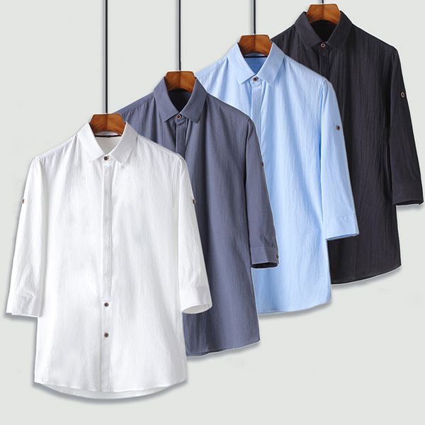 2020 new men's casual blouse cotton linen shirt three quarter sleevetee shirt spring autumn summer handsome men, White;black