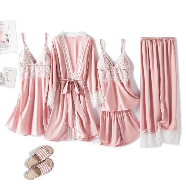 2020 spring silk pajamas sets 5 piece pyjamas sleepwear robe sleep lounge winter pijama lace night home clothing, Black;red