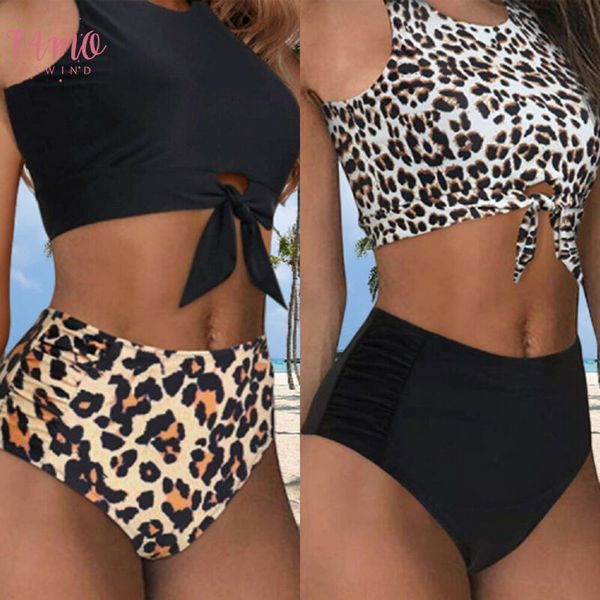 2020 womens leopard swimwear 2pcs high waist split swimsuit holiday brazilian bikini set beachwear polyester bikinis 2020 mujer, White;black
