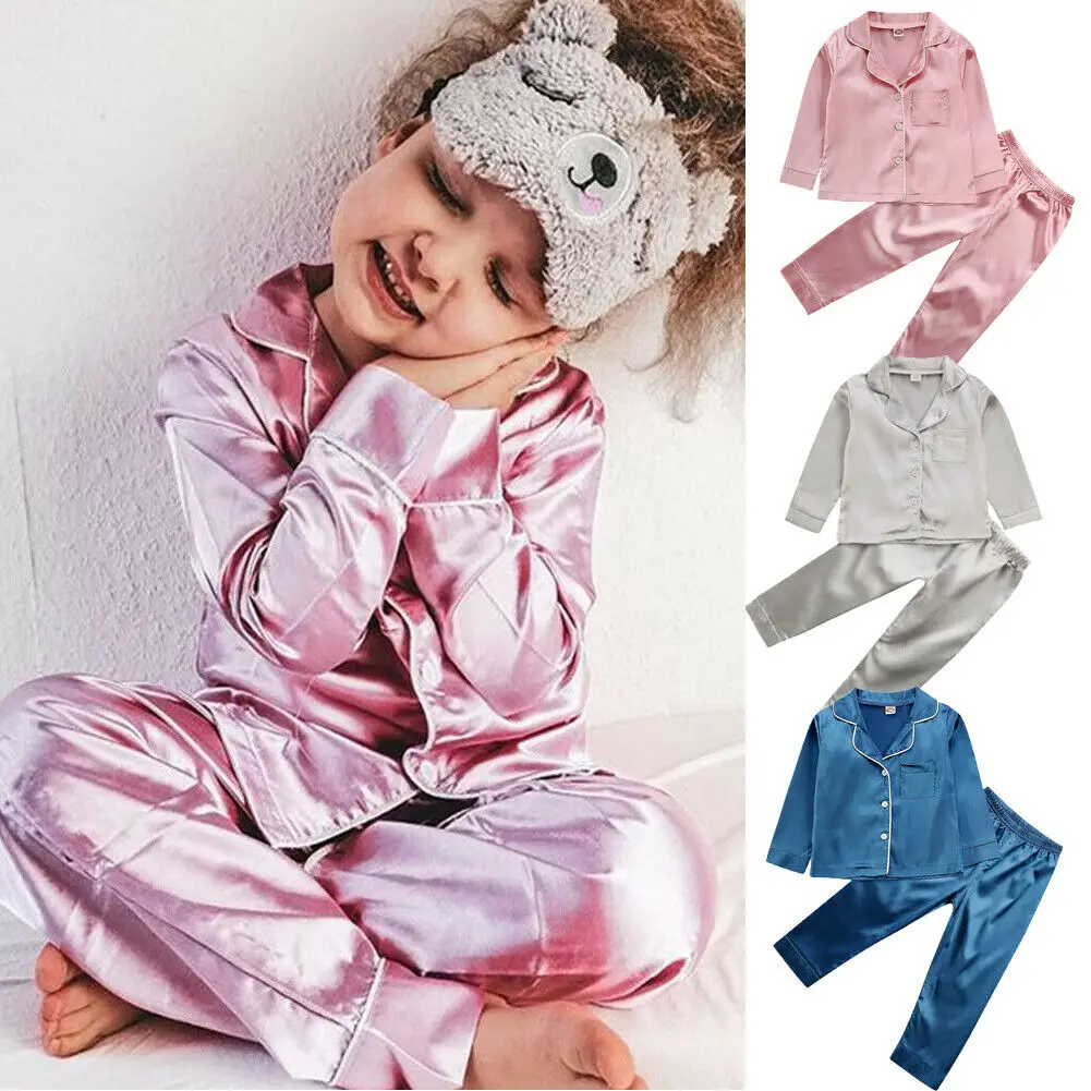 2021 Демисезонный для малышей; Детская пижама для мальчиков и девочек длинные рукава топы, штаны дома Твердые наряды шелковые пижамы комплект...