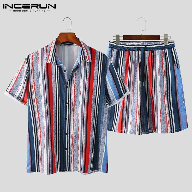2021 летние Для мужчин комплекты в полоску с отложным воротником футболка с коротким рукавом Пляжные шорты Уличная Повседневное Для мужчин Г...