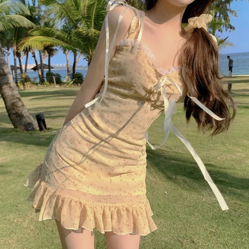 2021 модное женское платье с завязками, желтое милое мини-платье из хлопка, сексуальное сказочное платье Y2k, эстетичное элегантное пляжное пла...