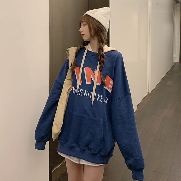 2021 autumn new loose hooded college style thin sweatshirt female letter printing color matching fashion r5cv, Black