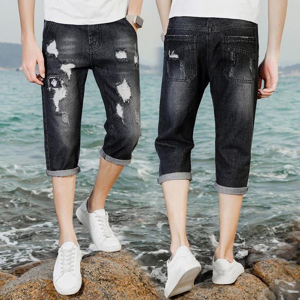 2021 fashion summer washing embroidery calf-length pants denim biker breeches hip hop cowboy teenagers men men's shorts, White;black