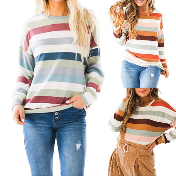 2021 new autumn and winter long-sleeved multicolor striped women's t-shirt casual loose round neck woman tshirts femme rnaa, White