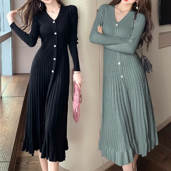 2021 new korean style winter knitting big sweater v large in the form of sheath buckle drill dress for woman ntix, Tan;black