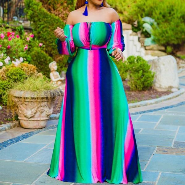 2021 shoulder off rainbow stripe women plus size african dress bloc rents even dressed in occasional beach long summer dresses k1bw, Black;gray