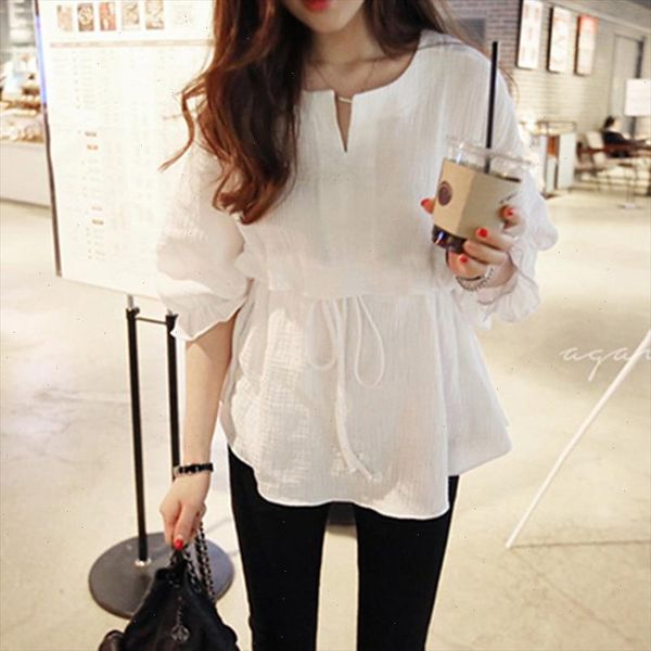 2021 spring models korean version of the seven point sleeves cotton and linen round neck tie shirt female ruffled shirt, White