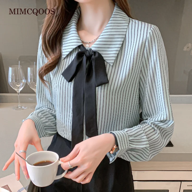 2022 Весенняя полосатая Офисная Женская блузка с бантом, женская блузка с длинным рукавом, повседневная Корейская Свободная рубашка поло с вы...