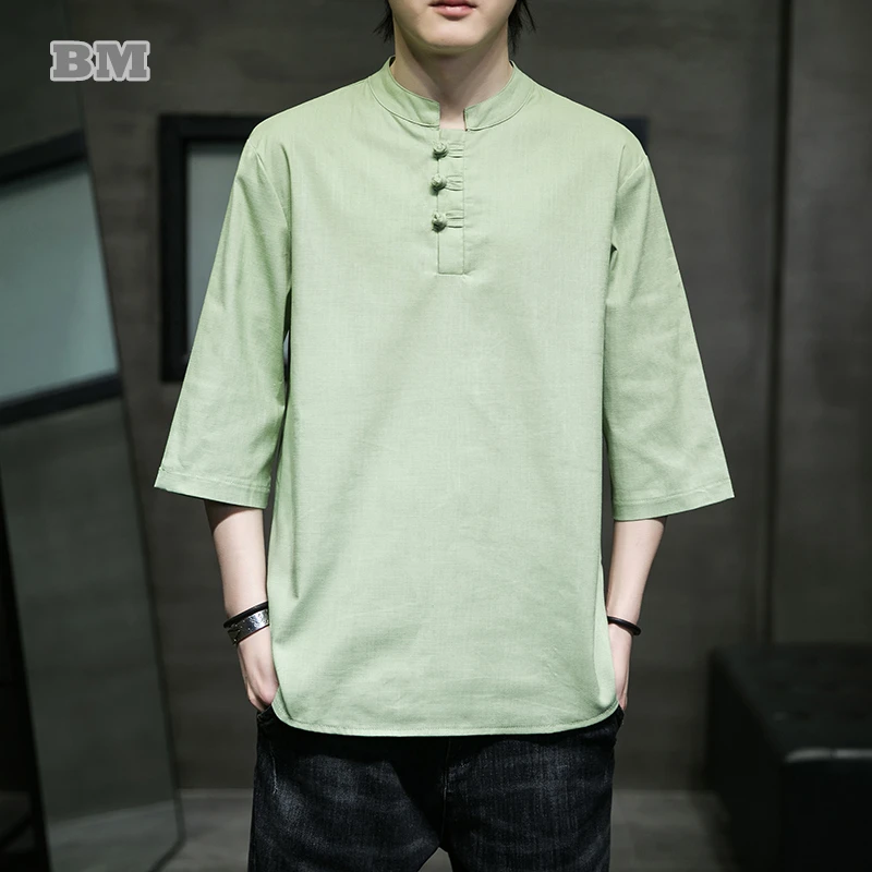 2022 Летний Тонкий Однотонный пуловер рубашка в китайском стиле кунг-фу тайчи Топ Мужская одежда Женская льняная с коротким рукавом