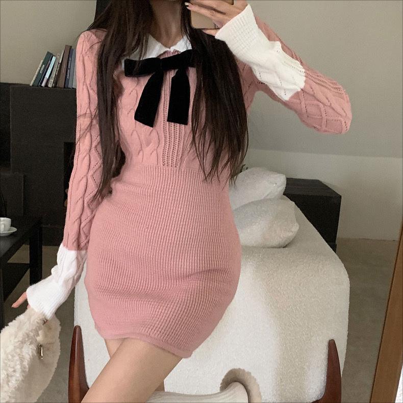 2022 Новая женская трикотажная юбка с длинным рукавом в студенческом стиле — корейская версия для осени/зимы One Size розовый