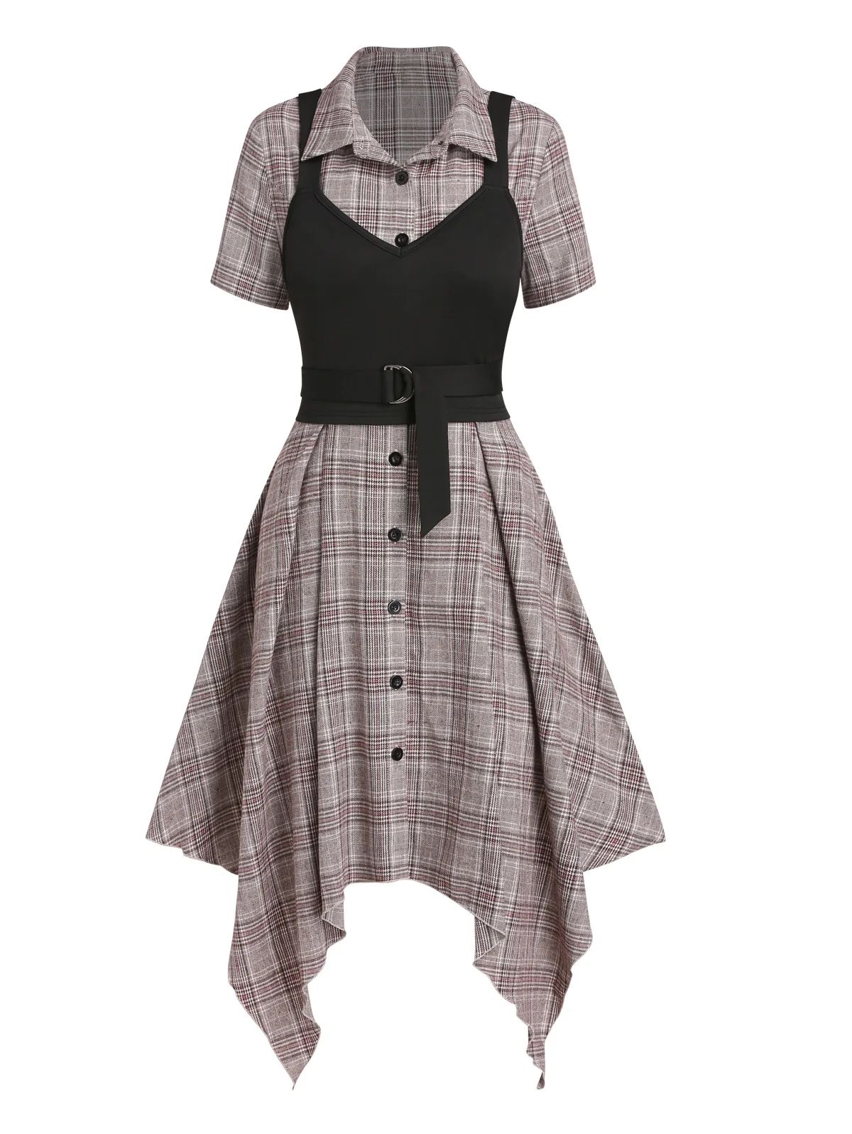 2022 женский модный комплект из двух предметов в стиле ретро, платье средней длины на пуговицах с принтом в клетку и однотонным поясом, топ на ...
