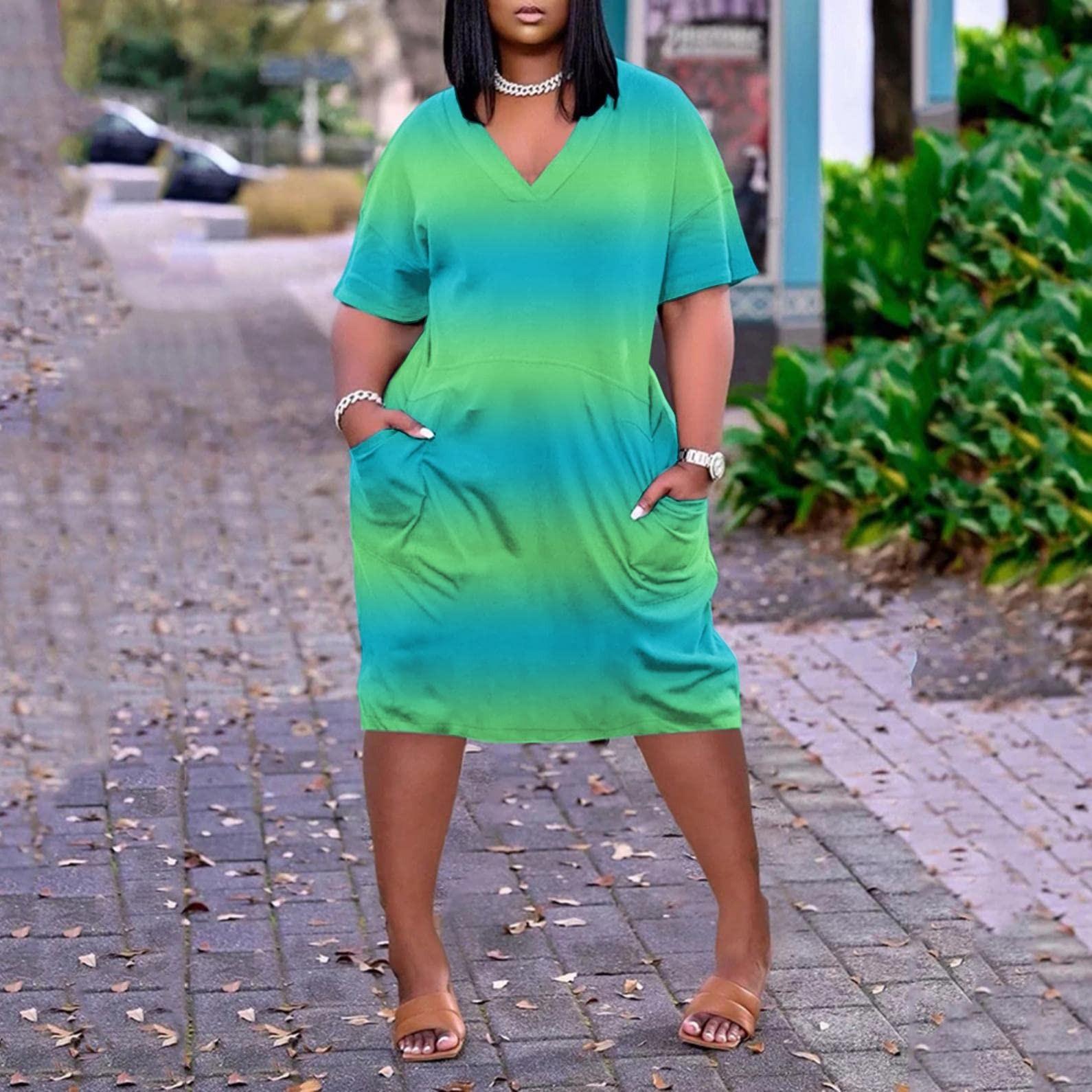 2022 женское летнее повседневное платье больших размеров с V-образным вырезом и короткими рукавами и карманами до колена L зелёный