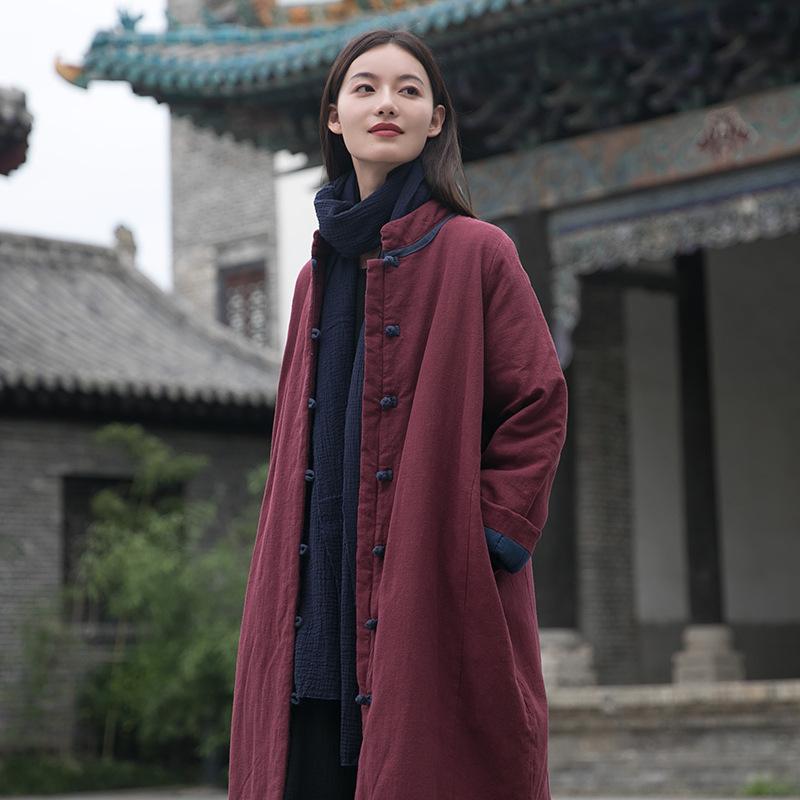 2022 зимнее новое винтажное художественное хлопковое пальто средней длины с контрастной пластиной и пряжкой, льняное свободное хлопковое пальто one size