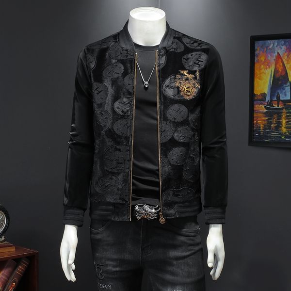 2022 autumn and winter flocking thorn embossed embroidered leather baseball uniform highend fabric fashion slim mens jacket, Black;brown