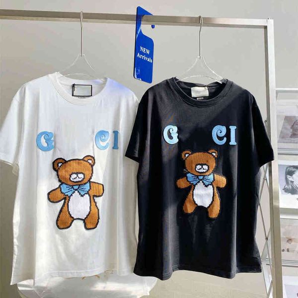 2022 factory wholesale new gu + cartoon bear ins short sleeve t-shirt women's summer loose embroidered casual bottom shirt, White