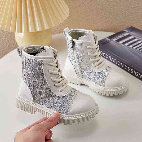 2022 girls fashion crystal sequin martin boots children' boots autumn and winter simple mesh girl booties lace-up platform boot l22071, Black;grey