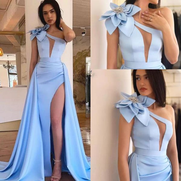 2022 sky blue prom dresses sheath one shoulder sleeveless floor length side sit satin custom made plus size formal occasion wear evening gow, Black