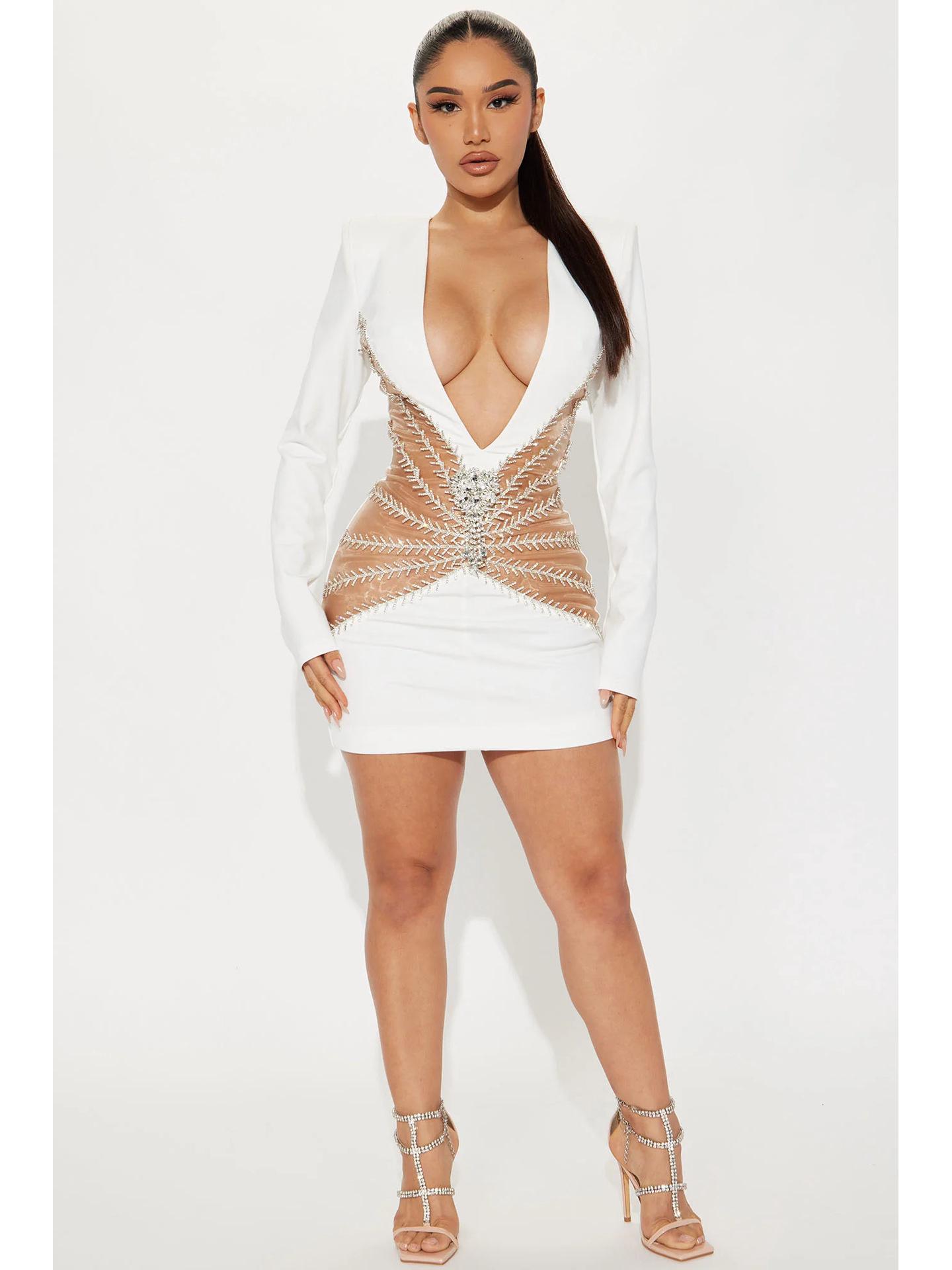 2023 Европейская и американская мода V-образный вырез сетчатое платье со стразами кисточки для женщин Large белый