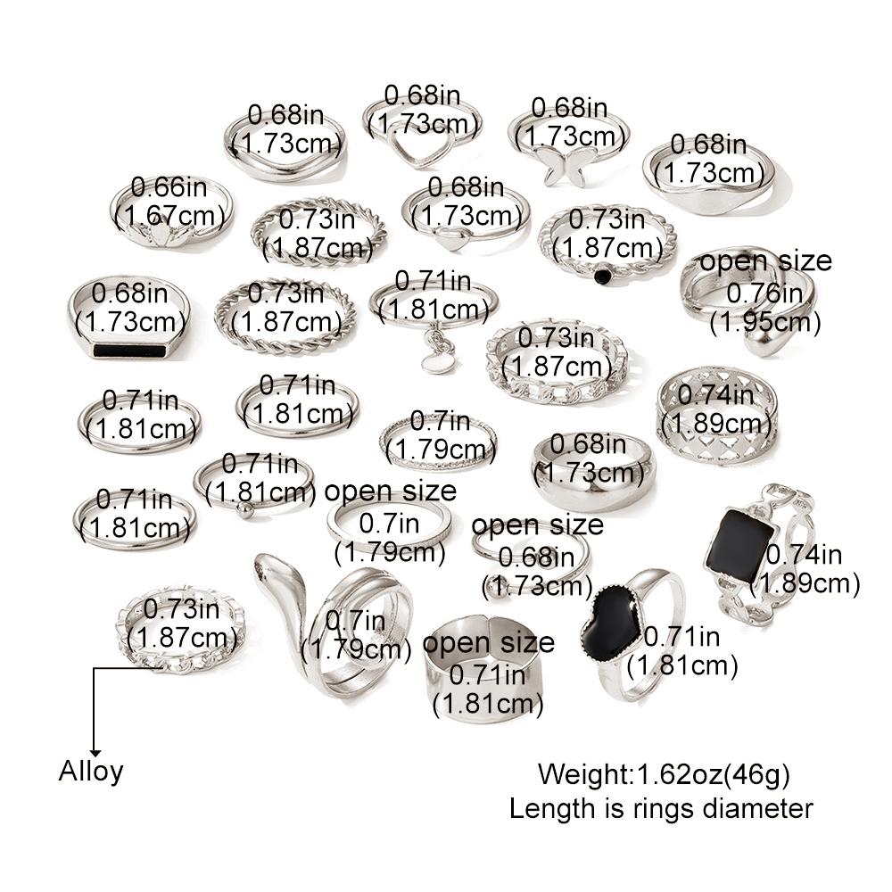 2023 Модный комплект колец Черное капельное сердце Квадратное кольцо 27 шт. Белый K Змея Квадратный комплект колец Ночной клуб Классические аксессуары Серебряное элегантное женское кольцо в подарок серебряный