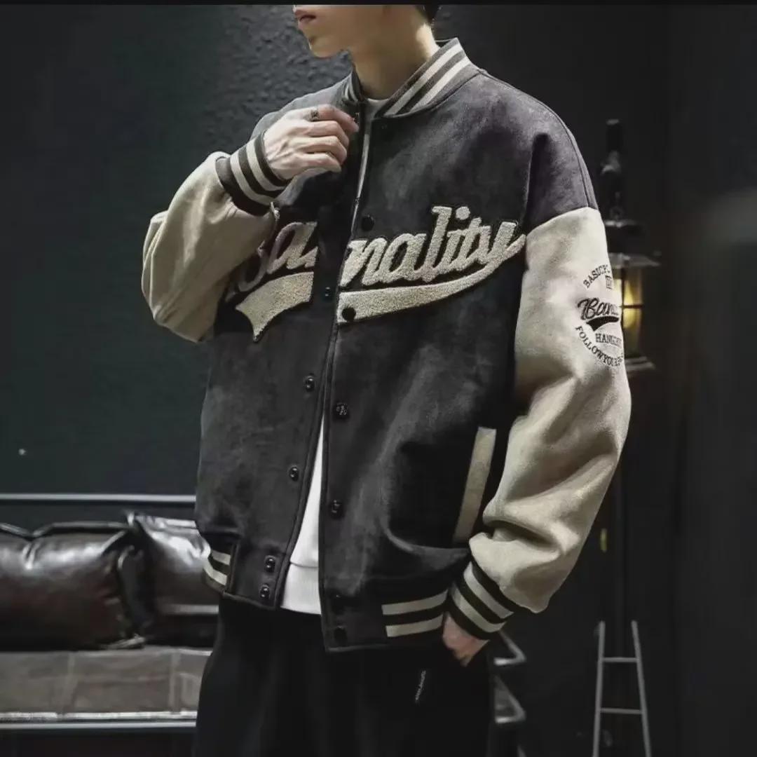 2023 Мужская замшевая ветрозащитная бейсбольная куртка с воротником-стойкой — модный японский ретро-стиль весна/осень M (80-100 jin) чёрный