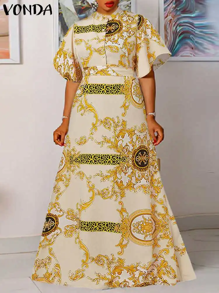 2023 винтажное платье VONDA с принтом, женский летний длинный сарафан с воротником-стойкой, богемный Повседневный длинный халат с коротким рукавом и пуговицами и поясом