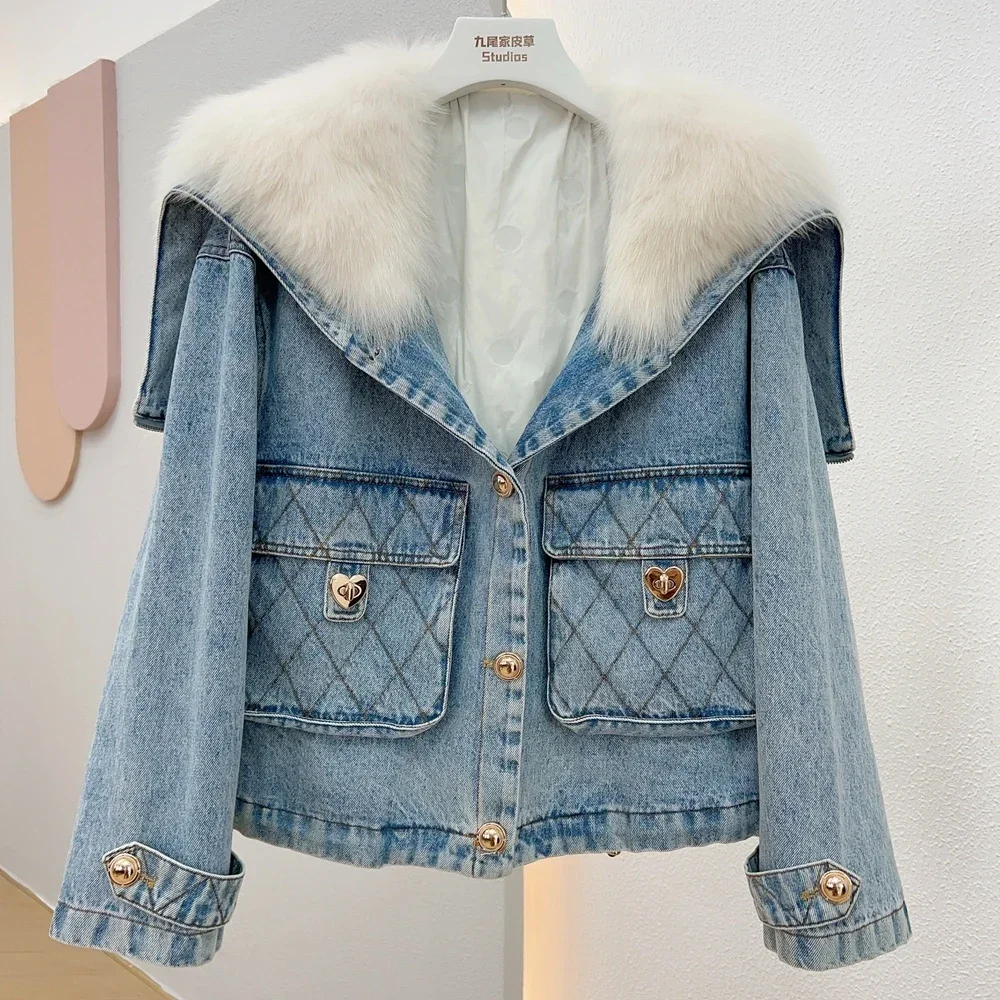 2023 женская зимняя Толстая джинсовая куртка на гусином пуху с воротником из натурального Лисьего меха, женские джинсовые пальто, парка, джинсовая куртка
