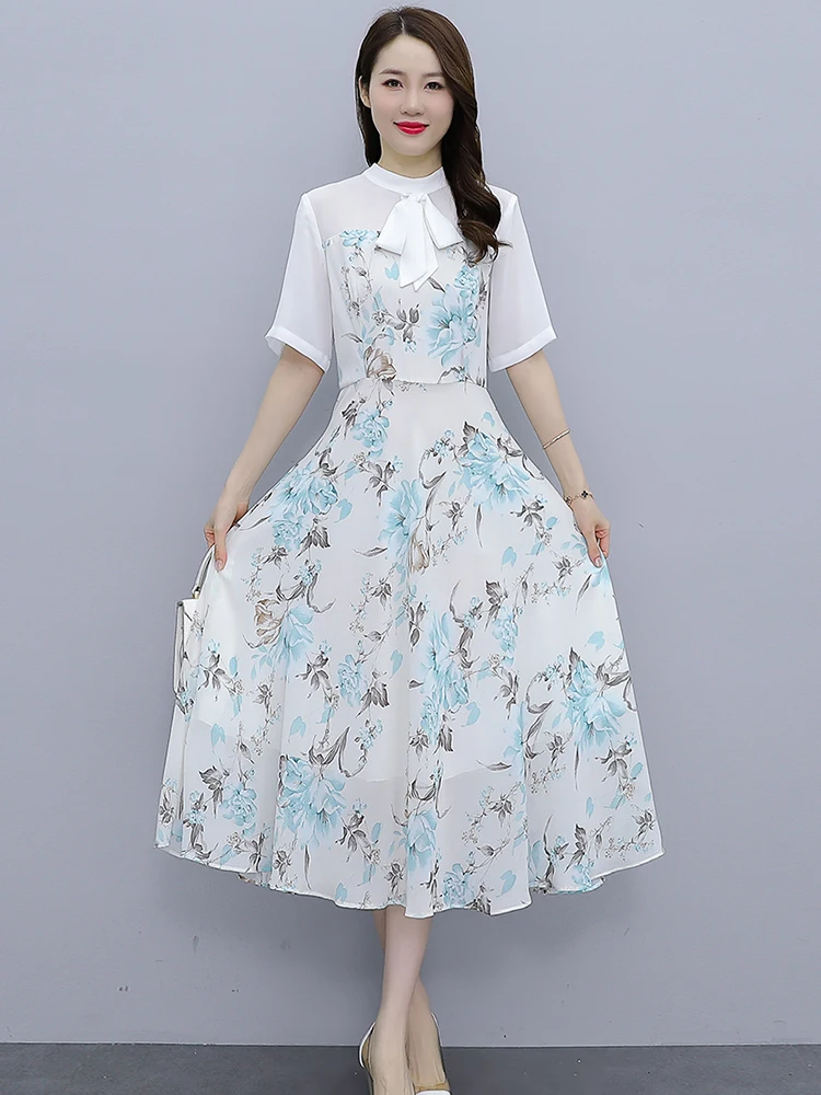 2023 летнее пляжное женское повседневное шифоновое белое длинное платье с бантом, Элегантная Модная Цветочная туника, вечерние наряды для вы...