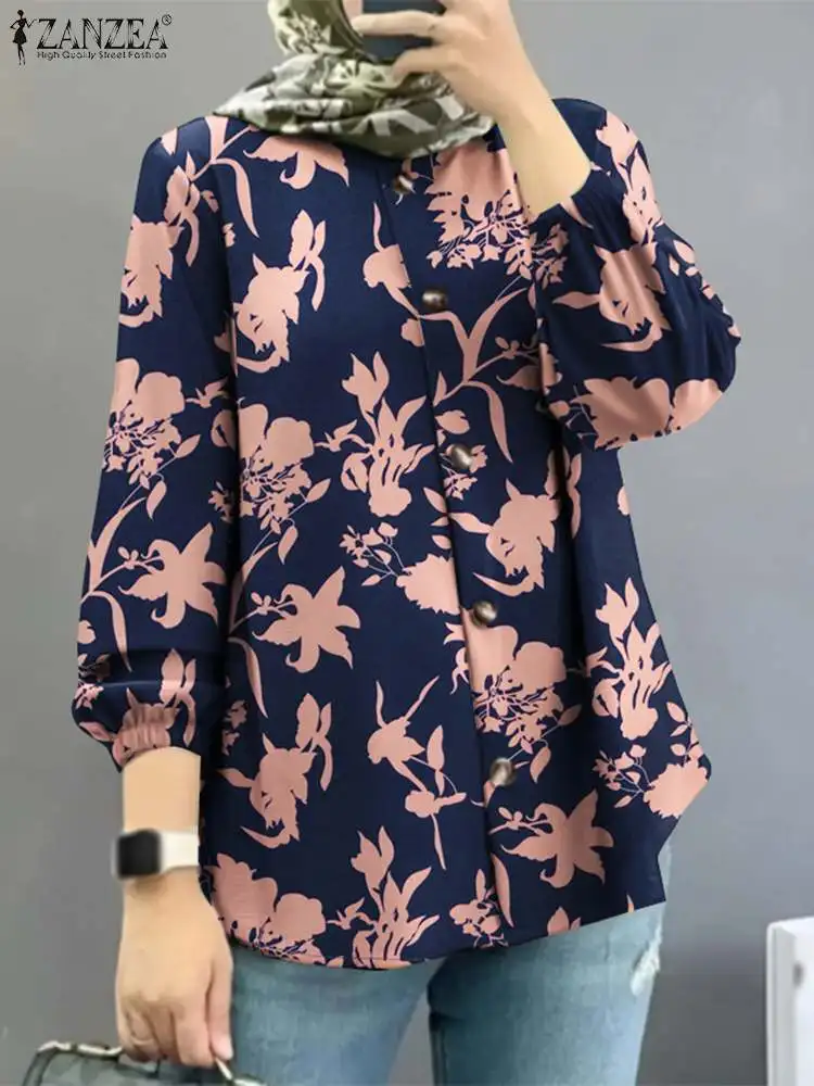 2023 ZANZEA женская мусульманская абайя блузка винтажные топы с цветочным принтом с длинным рукавом богемная Праздничная рубашка Повседневная мусульманская одежда