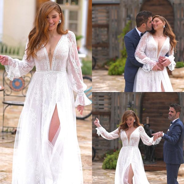 2023 beach split wedding dresses v neck lace appliqued long sleeve bridal gown sweep train robe de mariee, White