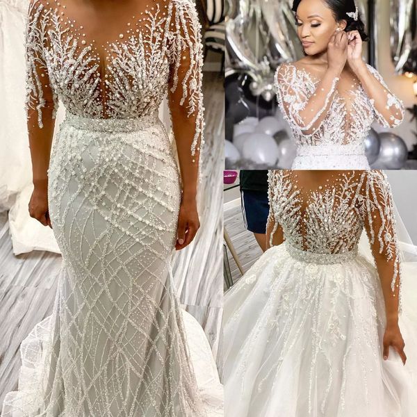 2023 luxury bridal gown gracious heavy beading long sleeve mermaid wedding dress with removable long tulle train, White