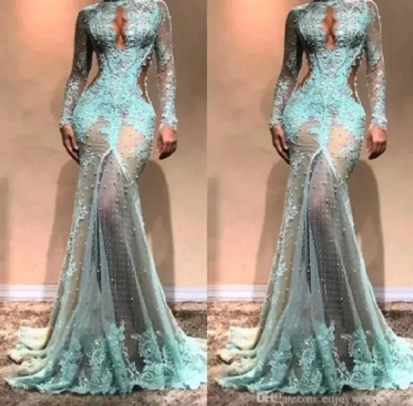 2023 mint green mermaid prom dresses long sleeves lace applique illusion beaded custom made long sleeves evening gown formal occasion wear v, Black