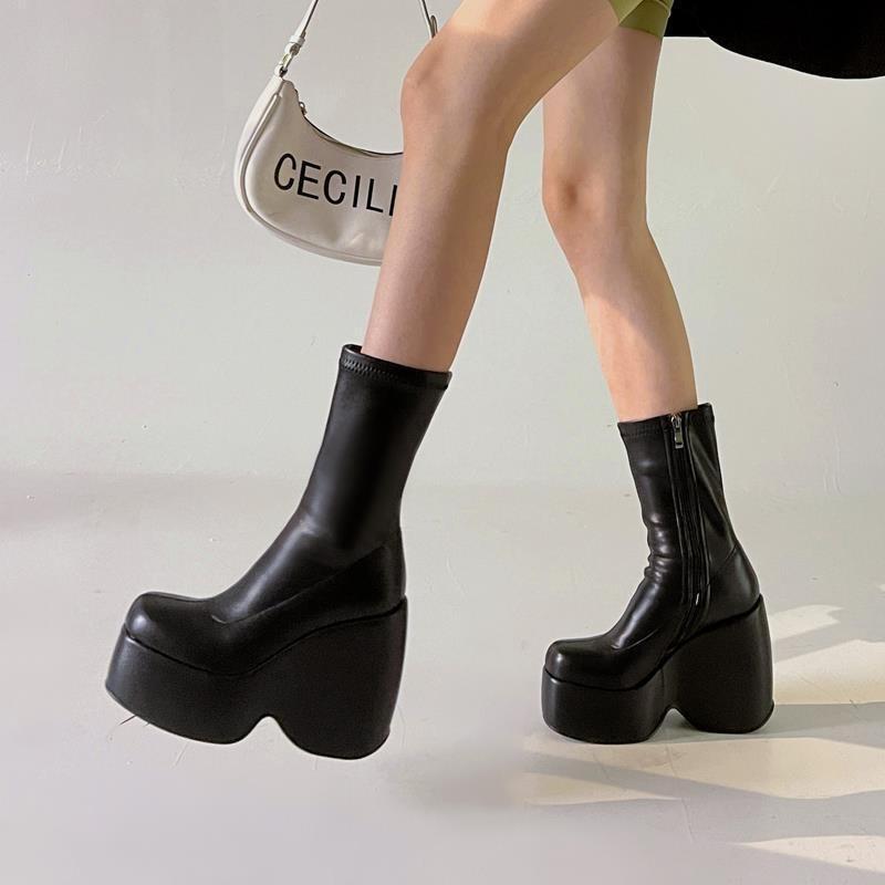 2024 Горячая Распродажа Женских Туфлей Современные Женские Сапоги Платформы До Середины Икры Женские Шитье Круглый Носок Боковая Молния Высокая Танкетка Туфли Женские 39