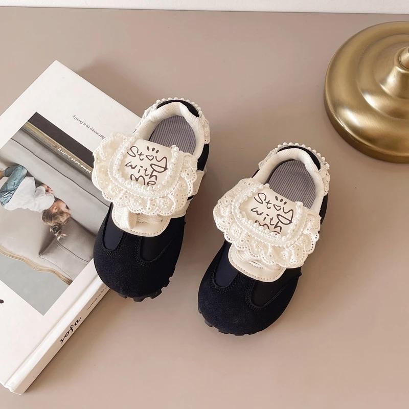 2024 Детская повседневная обувь для девочек, осенняя новая модная элегантная кружевная мягкая подошва, нескользящая универсальная повседневная шикарная спортивная обувь 23 чёрный
